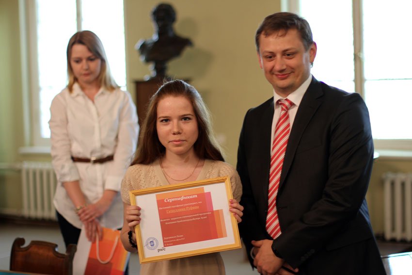 Счастливыми обладателями стипендий стали пять студентов КФУ: Яна Вафина, Кирилл Финогеев, Нафис Мухаметгалиев, Дарья Буторина, Руфина Гатауллина. Они в течение следующего учебного года ежемесячно будут получать 3000 рублей. Отбор состоял из двух конкурсов: в первом туре студенты писали эссе о том, какой они представляют компанию PricewaterhouseCoopers в 2020 году, а во втором презентовали свой видеоролик на тему «Что такое успех?» Борьба за стипендию была сложной, на одно место претендовали 9 человек.