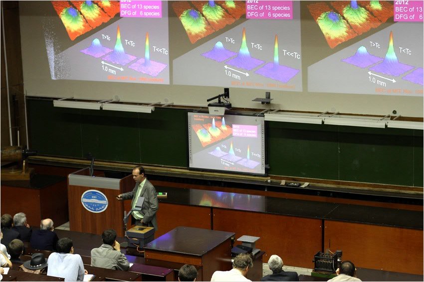 В начале своего выступления Рудольф Гримм рассказал о своем университете в Инсбруке, затем плавно перешел на тематику встречи, а в процессе своего рассказа умело вплетал в структуру своей лекции упоминания о значительных достижениях российских ученых в области физики.