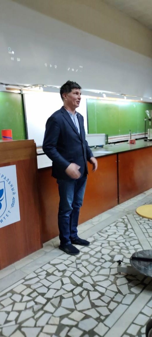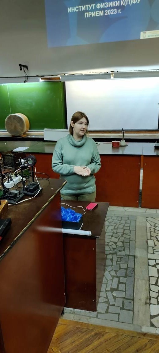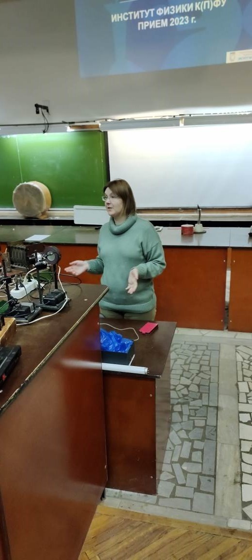 Слушатели посетили лабораторию общего физического практикума, кафедры общей физики, радиофизики, квантовой электроники и радиоспектроскопии, где старший научный сотрудник научно-исследовательской лаборатории магнитной радиоспектроскопии и квантовой электроники им. С.А. Альтшулера Роман Валерьевич Юсупов рассказал о новых технологиях и материалах, разрабатываемых в Институте физики.
