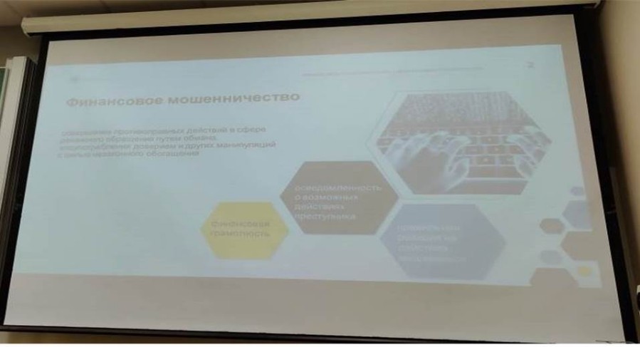 Далее он проинформировал о наиболее частых способах мошенничества- фишинге, скимминге, финансовых пирамидах, телефоных мошенничествах, рассказал простых правилах безопасности, "левых" сообщениях от банка и других госучреждений.