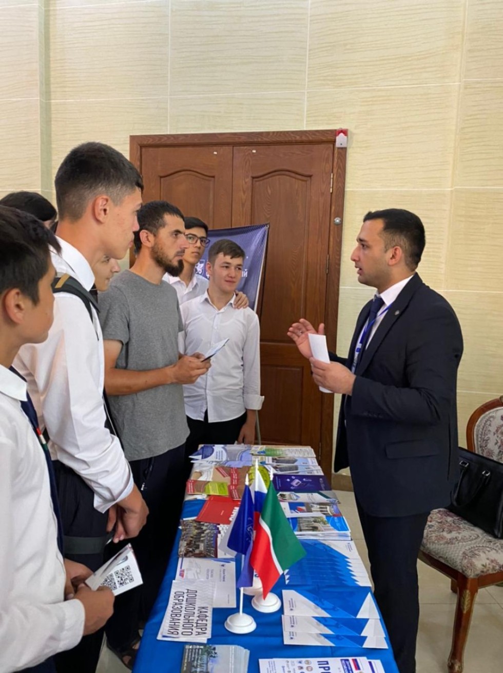 Институт филологии и межкультурной коммуникации КФУ представлял сотрудник Центра профориентационной работы и взаимодействия с работодателями Саъдиев Улугбек Мубинджонович. Он провел презентацию образовательных программ ИФМК КФУ, консультации по вопросам поступления абитуриентов, беседы с будущими выпускниками школ и их родителями, а также рассказал о новых программах и предложениях института.