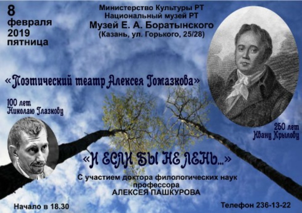 8 февраля 2019 года в музее Е.А.Боратынского под патронажем Министерства культуры РТ и Национального музея РТ прошел творческий литературно-музыкальный вечер, посвященный 250-летию великого российского просветителя, легендарного баснописца Ивана Андреевича Крылова. Мероприятие проходило в рамках серии «Поэтический театр Алексея Гомазкова», с участием профессора ИФМК КФУ А.Н.Пашкурова.