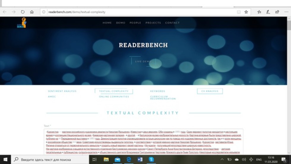 11 марта 2020 главные научные сотрудники, профессора НИЛ «Интеллектуальные технологии управления текстами» Марина Ивановна Солнышкина, Валерий Дмитриевич Соловьев и ведущий научный сотрудник лаборатории Владимир Владимирович Иванов, с коллегами-экспертами из Политехнического университета Бухареста (Румыния) Mihai Dascalu и StefanRuseti провели онлайн-семинар по вопросу включения русской версии автоматического анализатора сложности текста в международную платформу ReaderBench. Оценка восприятия и сложности текста осуществляются данным коллективом исследователей в рамках исследований, осуществляемых научной лабораторией «Информационные технологии управления текстами» Казанского федерального университета. Онлайн-встреча состоялась на кафедре теории и практики преподавания иностранных языков в Институте филологии и межкультурной коммуникации. Во время skype трансляции обсуждались вопросы, связанные с разработкой и внедрением интерактивной модели обучения стратегиям чтения «ReaderBench» применительно для российских учебников. ReaderBench - это многоцелевая, многоязычная и гибкая среда, которая позволяет оценить три основных текстовых признака: оценку на основе когезии, идентификацию стратегий чтения и оценку сложности текста.