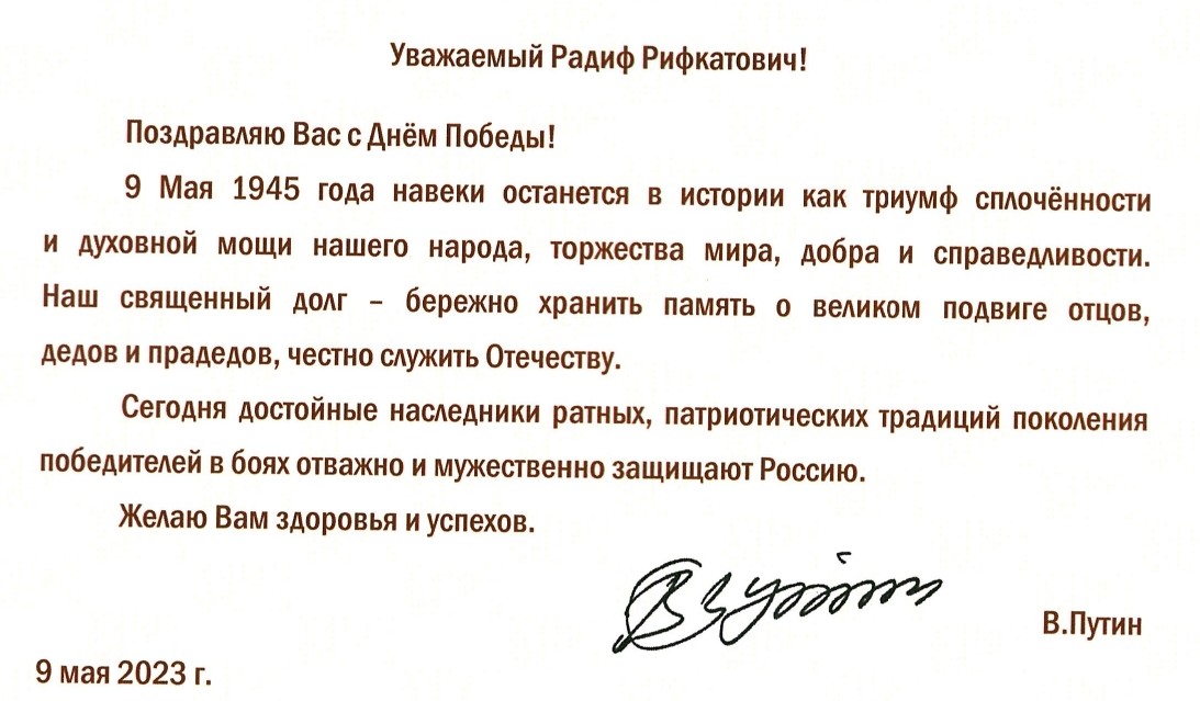 В адрес директора Института филологии и межкультурной коммуникации КФУ Радифа Рифкатовича Замалетдинова поступило поздравление Президента РФ Владимира Путина с Днем Победы