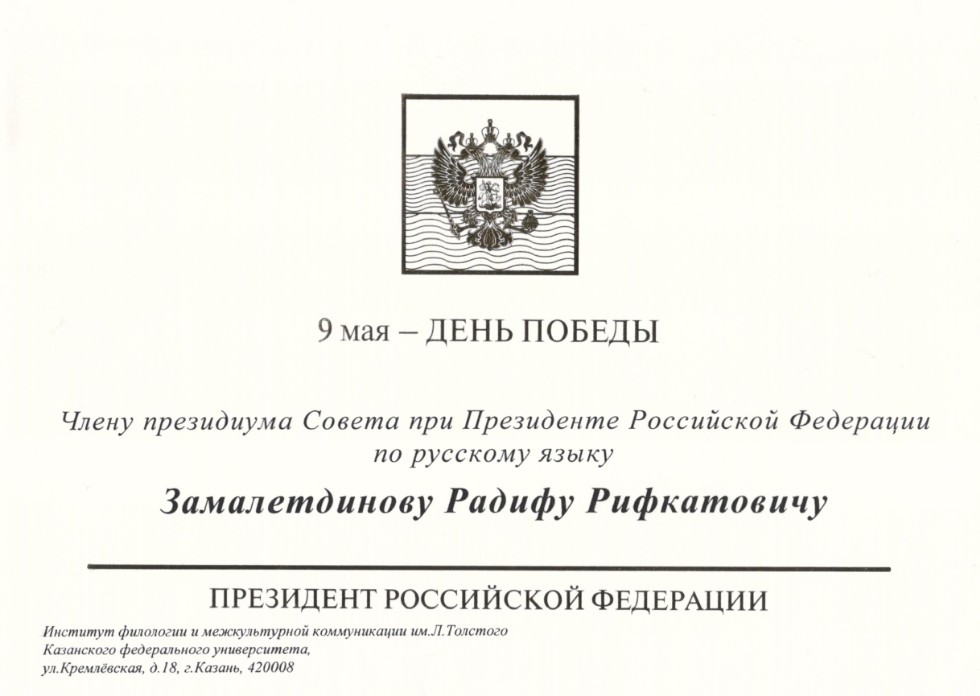 В адрес директора ИФМК КФУ Радифа Рифкатовича Замалетдинова поступило поздравление Президента РФ Владимира Путина с Днем Победы