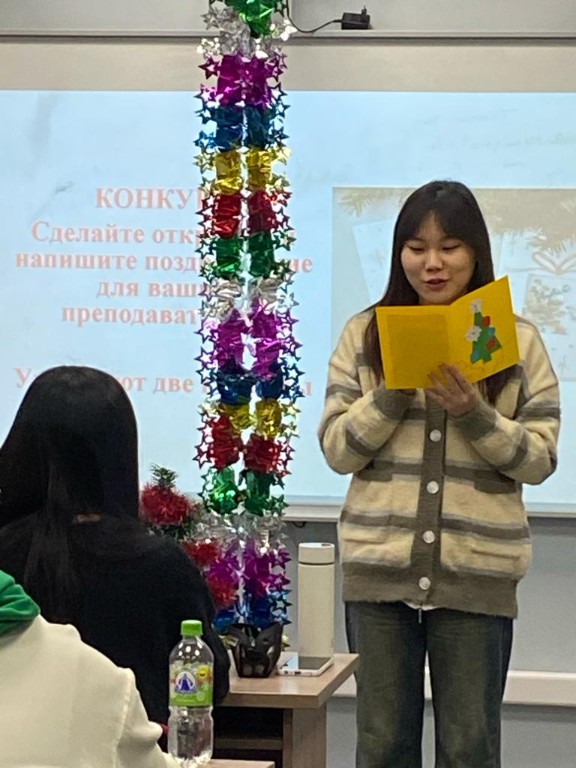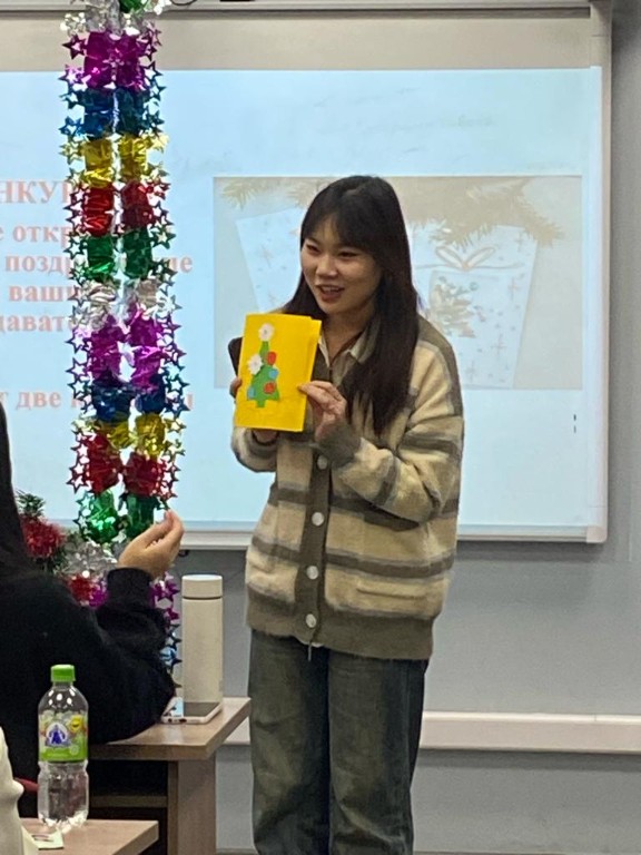 Стажеры активно принимали участие и в конкурсах: своими руками сделали новогоднюю открытку и написали поздравление для своих преподавателей, рисовали елку и снеговика, вспоминали и образовывали «зимние слова», отгадывали загадки, танцевали, пели популярные новогодние песни. Стажеров поддерживали и вдохновляли зав. кафедрой русского языка и методики его преподавания Д.И. Рахимова, доценты Г.Х. Алеева, З.Ф. Юсупова, Ю.К. Лукоянова, специалист центра тестирования и экспертиз при КФУ Аветисян Гермине, аспиранты Хань Фан, Ван Шусянь.