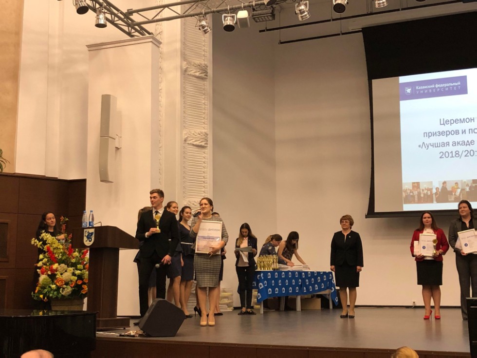 Приветственным словом церемонию награждения открыла директор Департамента по молодежной политике Казанского федерального университета Юлия Владимировна Виноградова: «В этом году все конкурсы и фестивали, проводимые в стенах университета – особенные, ведь они приурочены к юбилею родной аlma mater. Сегодня мы чествуем призеров и победителей одного из самых больших и интересных конкурсов – «Лучшая академическая группа КФУ», а также крупного интеллектуального фестиваля. Я бы хотела поблагодарить коллег – заместителей директоров по воспитательной и социальной работе и кураторов групп за ваш труд и проделанную работу со студентами Казанского университета».
