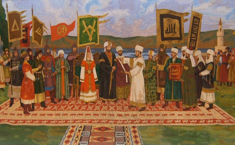 На цокольном этаже Памятного знака, где размещается музейно-выставочный комплекс, им было продемонстрировано мозаичное панно "Принятие булгарами ислама". Автор эскиза и руководитель группы художников-мозаичистов доцент кафедры изобразительного искусства и дизайна ИФИ КФУ, член Союза художников РФ - Фарит Валиуллин. Панно сделано на основе всех существующих картин и графических работ на эту тему. На нем изображена встреча с посланниками халифа. В центре - Алмуш-хан с супругой, посол халифа Ибн Фадлан, вожди булгарских племен с их знаменами, отличительными знаками. Изображен момент прочтения послания халифа Аль-Муктадира. Вокруг - представители болгарских родов, различных народов, проживавших на болгарской земле. Стоят они на армянском ковре. Влияние Армении, христианского государства, на Булгар было очень большим. А в то время армяне славились производством ковров. Основной и самый важный исторический источник этого события - "Записка" о путешествии на Волгу Ахмеда Ибн Фадлана, который посетил Волжскую Булгарию в составе посольства аббасидского халифа Аль-Муктадира. Посольство вышло из Багдада в 921 году и прибыло в Волжскую Булгарию в мае 922 года. Ибн Фадлан оставил подробный отчет о своем путешествии, в котором достоверно описал момент принятия ислама булгарами и привел множество уникальных сведений этнографического характера.