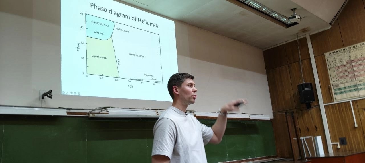 Затем Алакшин Егор Михайлович представил лекцию о квантовых жидкостях гелий-3 и гелий-4, их уникальных свойствах и применении в физике низких температур.