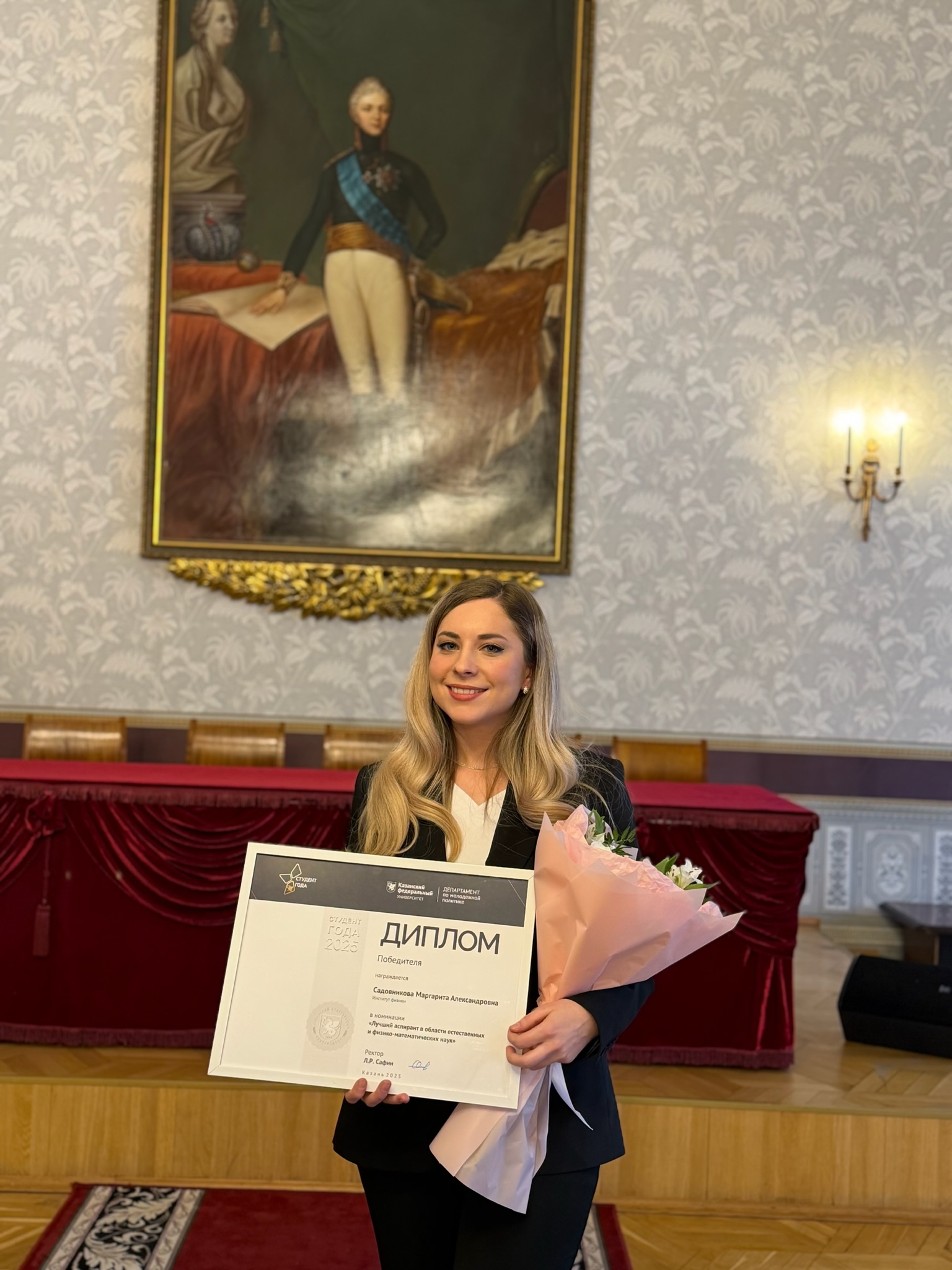 10 февраля в Императорском зале Казанского университета состоялась торжественная церемония награждения победителей конкурса "Студент года КФУ 2025". Победителем конкурса в номинации "Лучший аспирант в области естественных и физико-математических наук" стала аспирант кафедры медицинской физики Маргарита Садовникова.