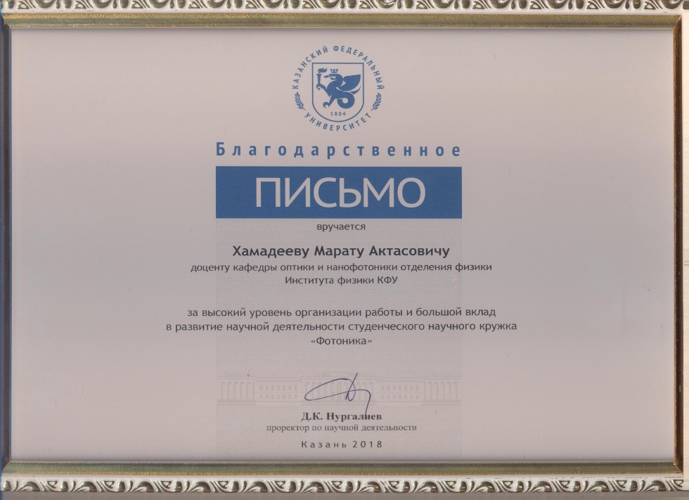 Научный кружок "Фотоника" Института физики КФУ по итогам конкурса студенческих научных кружков университета занял 3-е место по направлению «Естественные и технические науки» в 2018 году.
