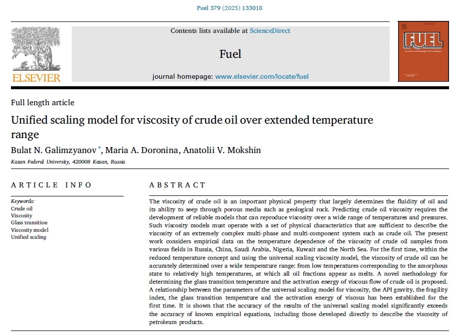 B.N. Galimzyanov, M.A. Doronina, A.V. Mokshin, Unified scaling model for viscosity of crude oil over extended temperature range // Fuel 379, 133018 (2025).
