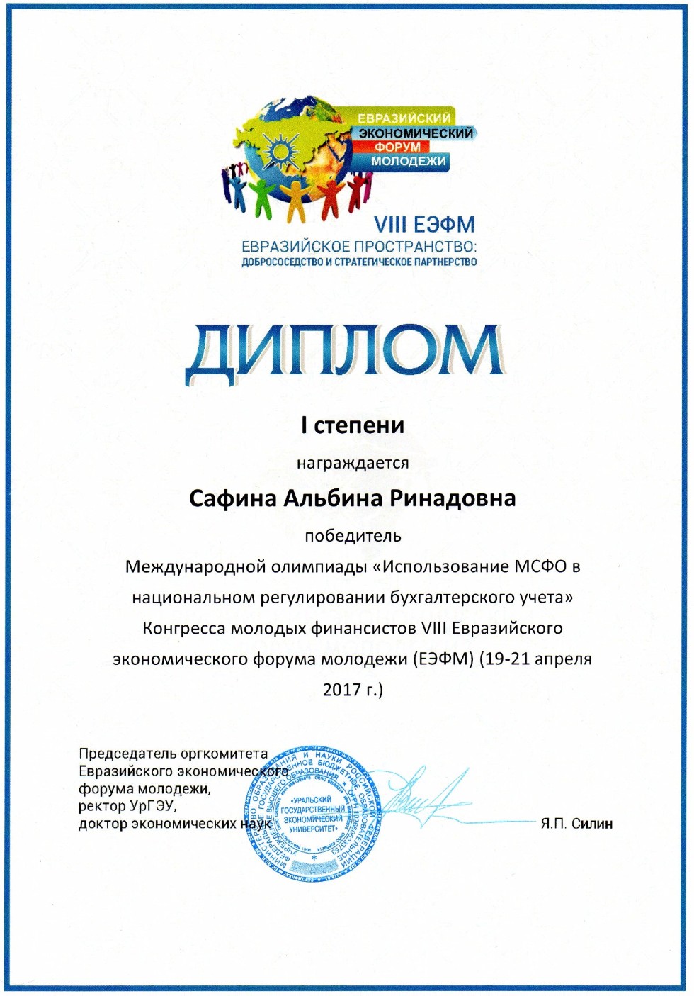 Финал международной олимпиады проходил с 19 по 21 апреля 2017 года в Уральском государственном экономическом университете в рамках Конгресса молодых финансистов VIII Евразийского экономического форума молодежи (ЕЭФМ). Международная олимпиада «Использование МСФО в национальном регулировании бухгалтерского учета» включала три этапа: тестирование и решение конкурсных задач по МСФО; творческий конкурс (представление команды); защита научных проектов. Команда Казанского федерального университета представила научный доклад на тему: «Совокупный финансовый результат периода: проблемы представления информации в финансовой отчетности».