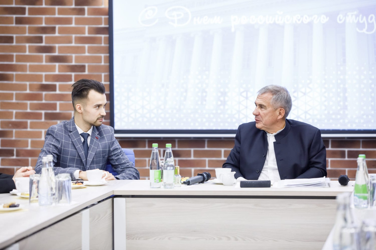 Также студенты нашего Института - Артамохина Валерия, Грязютина Татьяна и Давыдов Денис - приняли участие во встрече с Президентом Татарстана Рустамом Миннихановым. В формате чайного стола все желающие студенты могли задать любые интересующие их вопросы.