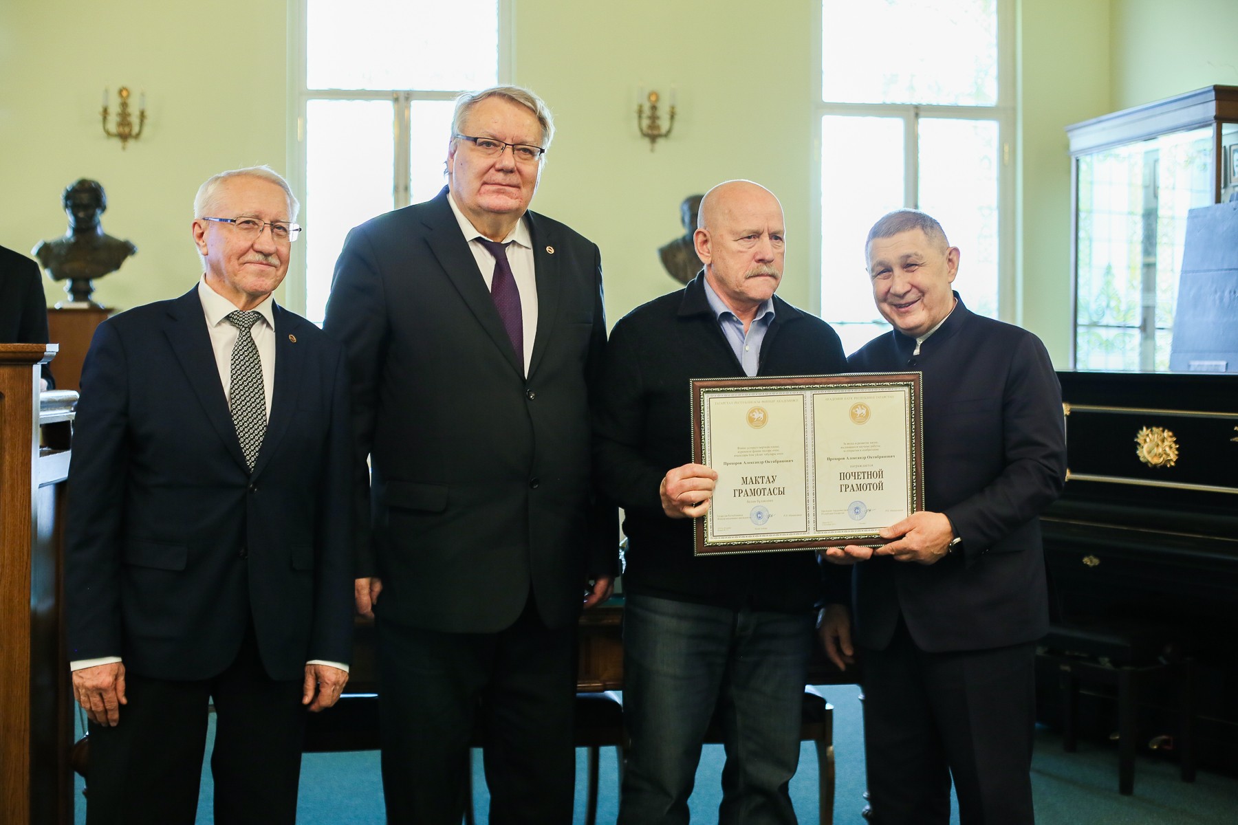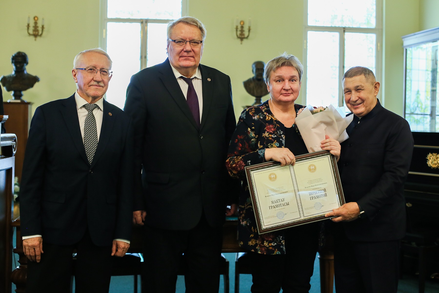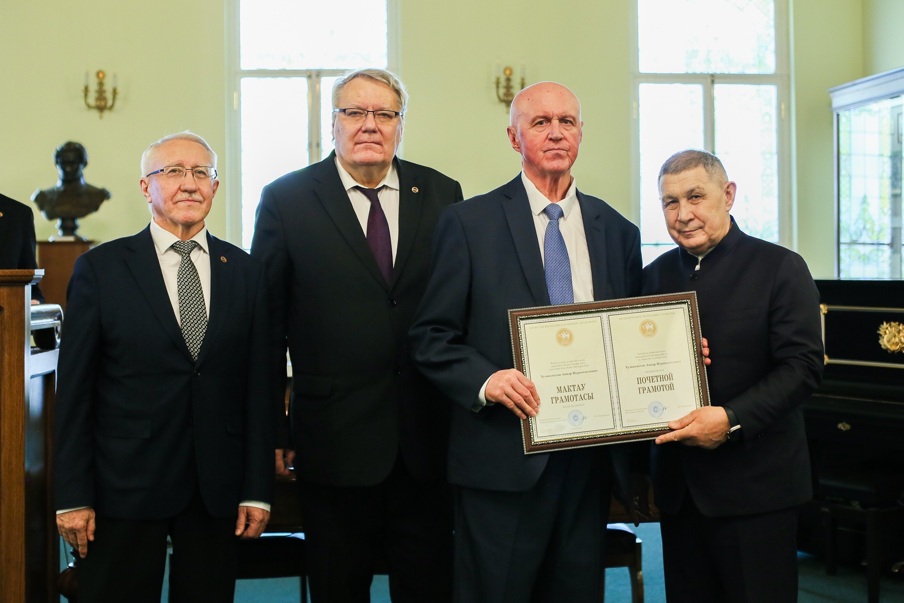 Ученым Института психологии и образования президент Академии наук Республики Татарстан Рифкат Минниханов вручил Почетные грамоты Академии наук РТ. В награждении приняли участие проектор по научной деятельности КФУ Дмитрий Таюрский, Президент Казанского университета Рияз Минзарипов.