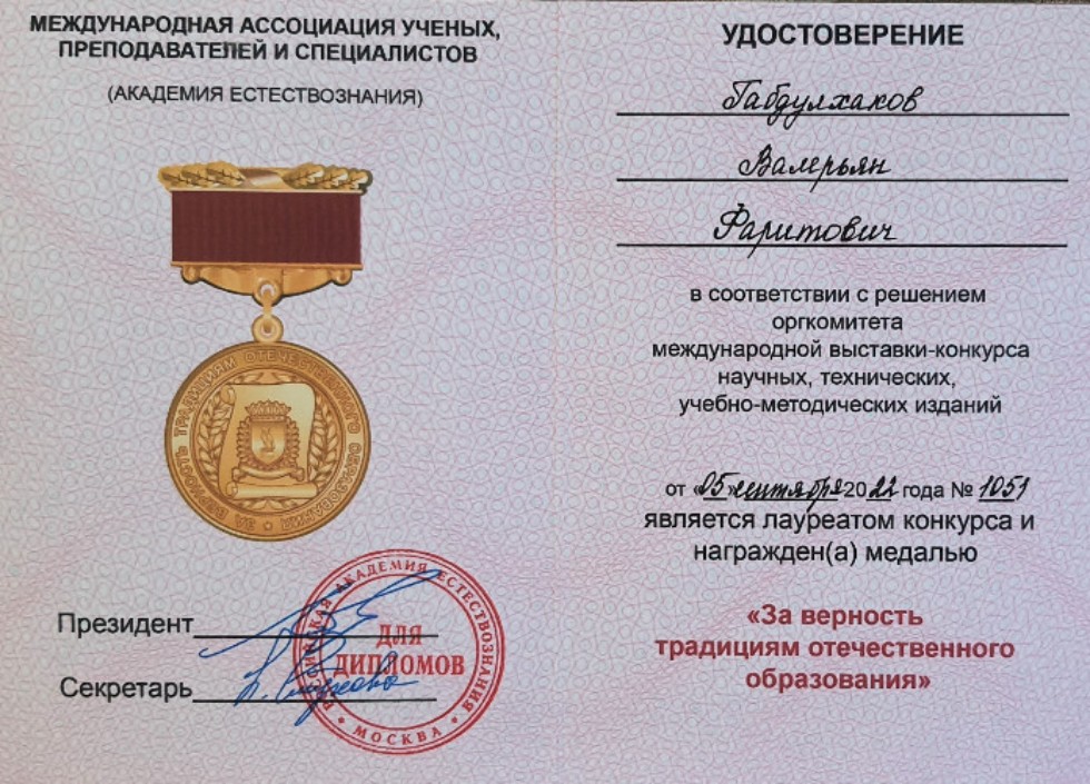 По итогам прошедших в 2022 г. международных книжных выставок-конкурсов в России, Германии, Испании, Великобритании, США были определены лауреаты – авторы лучших книг. В Москве российским авторам была вручена медаль «За верность традициям отечественного образования». Такой медалью награждаются авторы высокорейтинговых книг – лауреаты международных книжных выставок-конкурсов –– преподаватели высшей школы, ученые, научные работники.