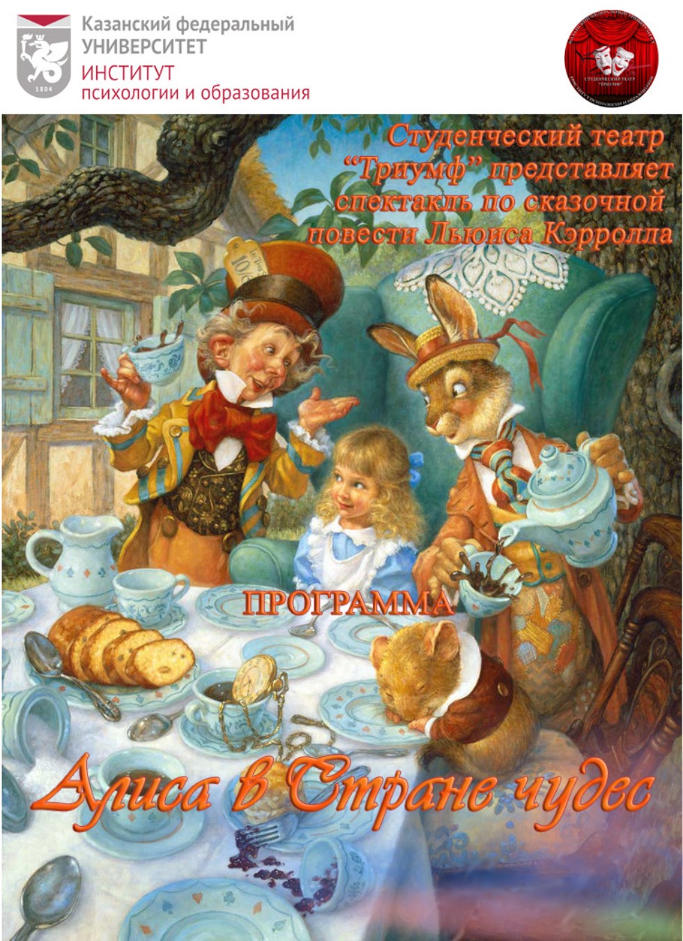 Открытием для всех студентов Института психологии и образования КФУ стал спектакль-мюзикл по повести Льюиса Кэрролла «Алиса в Стране Чудес», показанный 14 декабря 2017 года участникам Международного конкурса исследовательских, проектных и творческих работ студентов и учащихся 9-11 классов «Учитель в мультикультурном мире». Студенты 3 курса составили сценарий по известному произведению английского писателя, удивив зрителей новым прочтением зарубежной классики. Артистические способности студентов были направлены на выражение своей авторской идеи – чудо живет среди нас, мы сами – часть этого чуда. Сама жизнь есть чудо! И артисты показали через слова, музыку,танцы, репризы, костюмы, декорации, что надо жить, удивляться и радоваться жизни. Талантливая игра актеров Валиуллиной Айгуль, Теуважуковой Анны, Филипповой Елены, Галиуллиной Альбины, Лыжиной Марины, Ахтямовой Гульназ, Ахмадиевой Алины, Антоновой Анастасии, Закиевой Раили, Мухаметзяновой Алины не оставила никого равнодушными. Главным открытием в этой постановке стала студентка 2 курса Иванова Оксана в роли Алисы. Яркий, сочный, живой, интересный и оригинальный образ Королевы создала артистка театра Теуважукова Анна. Электронную презентацию на высоком творческом уровне подготовила Юнусова Эльмира.