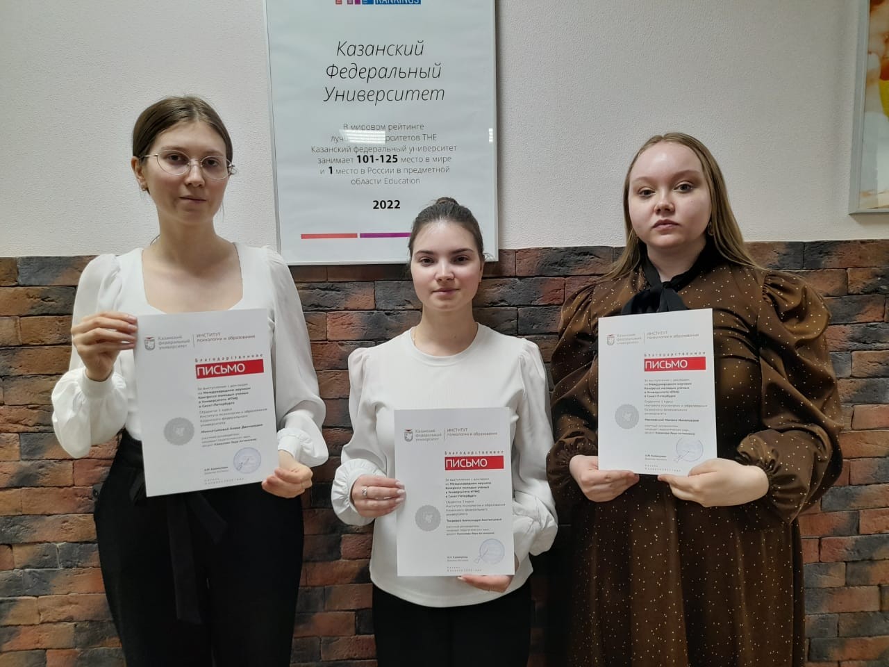Студенты кафедры начального образования Института психологии и образования в апреле участвовали с результатами научных исследований в работе Конгресса молодых исследователей в Университете ИТМО (Санкт-Петербург). За целеустремленность, интерес и приверженность к науке, результаты в научных проектах студенты Минхатыпова Алина, Таирова Александра, Ивановская Милана, Шигапова Гульгена отмечены Благодарственными письмами директора Института психологии и образования, доктора исторических наук, профессора Калимуллина Айдара Минимансуровича.