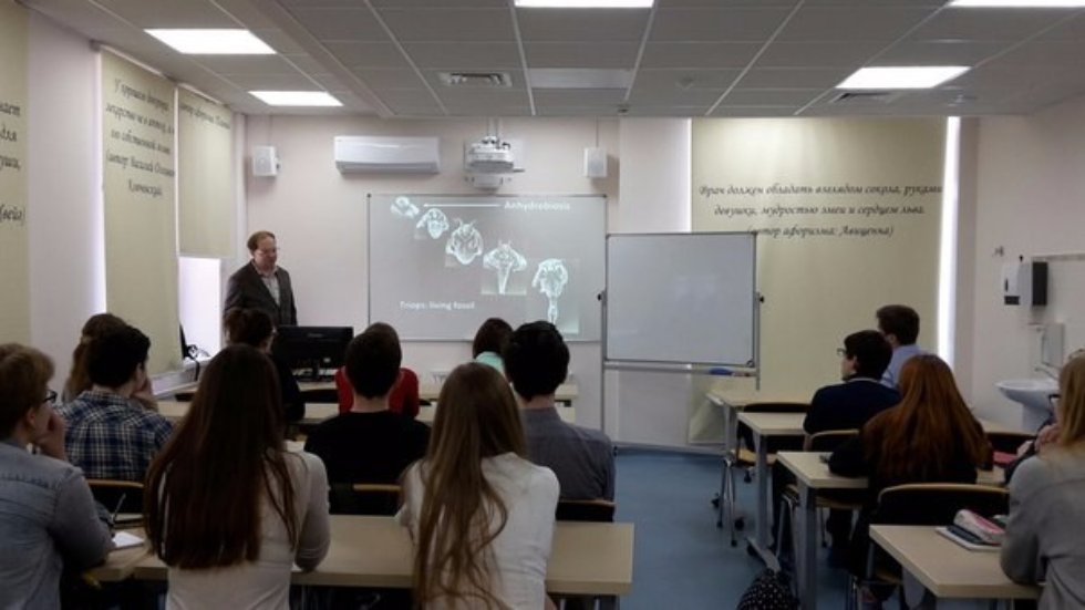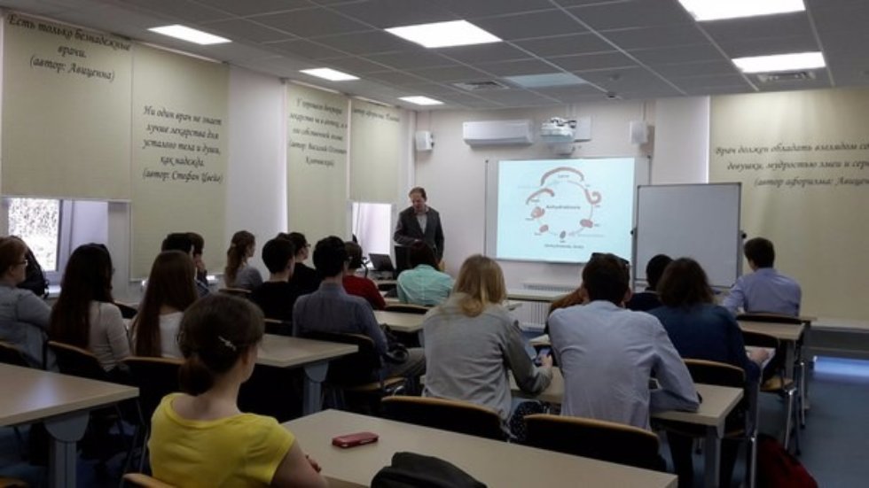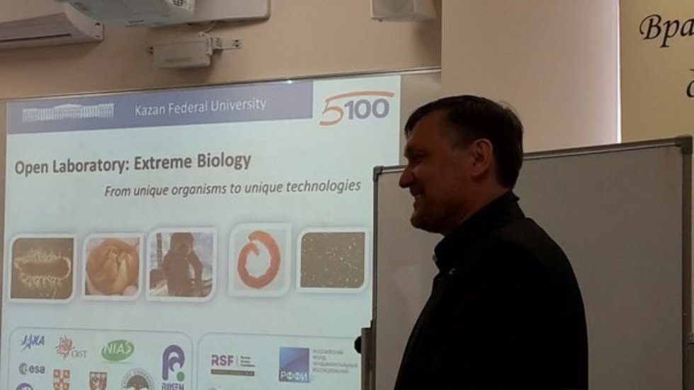 Вчера, 18 апреля для студентов и сотрудников кафедры зоологии и общей биологии состоялась открытая лекция ведущего научного сотрудника института RIKEN, заведующего Лабораторией «Экстремальная биология» КФУ Гусева Олега. Олег Александрович рассказал о развитии, возглавляемой им лаборатории, о продолжающихся и новых проектах. Были озвучены результаты центрального проекта лаборатории по изучению ангидробиоза в спящей хирономиде P. vanderplanki, недавно стартовавшего проекта по изучению спячки у сонь-полчков, дан экскурс в историю космической биологии. Кроме того, студентам-зоологам впервые в стенах университета были продемонстрированы результаты совместного проекта КФУ с Онкологическим диспансером РТ по ранней диагностике рака молочной железы. Студента было наглядно продемонстрировано как современные методы молекулярной биологии могут помочь в решении самых разнообразных задач, от классических вопросов фундаментальной биологии и зоологии до реального применения в клинике. В завершении, для ребят провели экскурсию во вновь открытые лабораторные помещения совместной лаборатории КФУ-Рикен.