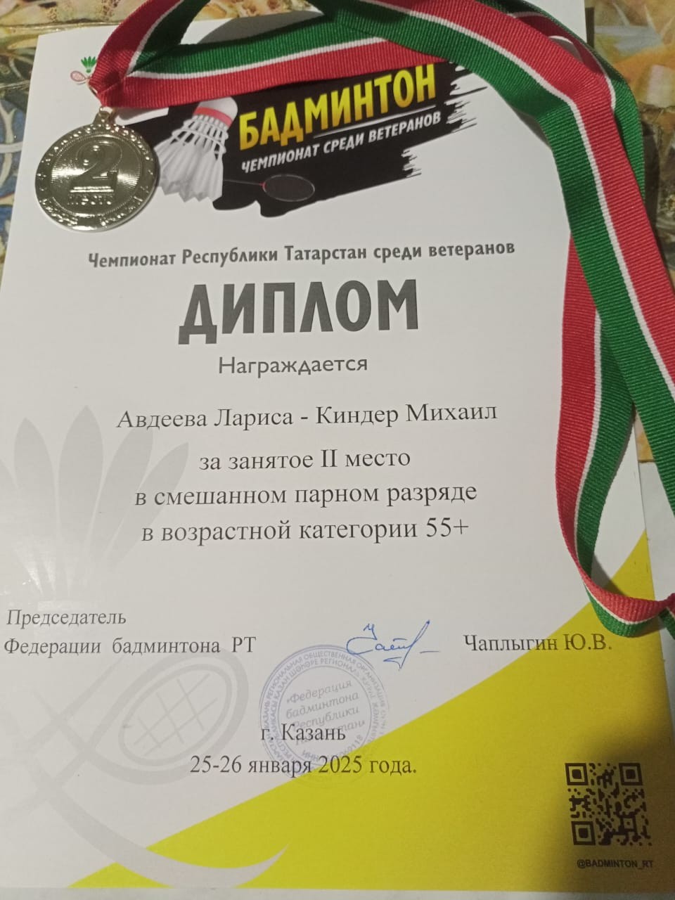 26 января 2025 года во дворце Бадминтона состоялся чемпионат Республики Татарстан по бадминтону среди ветеранов. 2 место в смешанной паре (категория 55+) заняла команда с участием Ларисы Авдеевой и Михаила Киндера. В категории 55 лет и старше в мужском парном разряде 3 место заняли Равиль Галиуллин и Камиль Галиуллин.