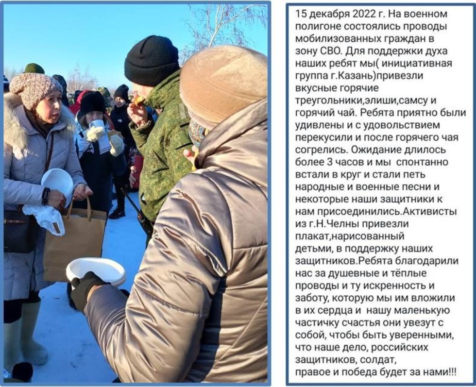Также представители Совета ветеранов КФУ 15 декабря приехали на полигон для поддержки мобилизованных в зону СВО. Они привезли горячий чай, горячие и вкусные треугольники, элеши, самсу. Ребята были приятно удивлены и горячо благодарили за искренность и заботу: «Мы сохраним в своем сердце ваше тепло. Большое спасибо!»