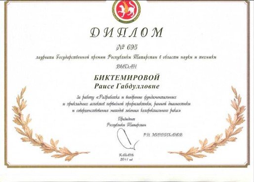 Вручение президентом РТ Минихановым Р.Н. Государственной премии Республики Татарстан в области науки и техники проф. кафедры анатомии, физиологии и охраны здоровья человека Биктемировой Р.Г.