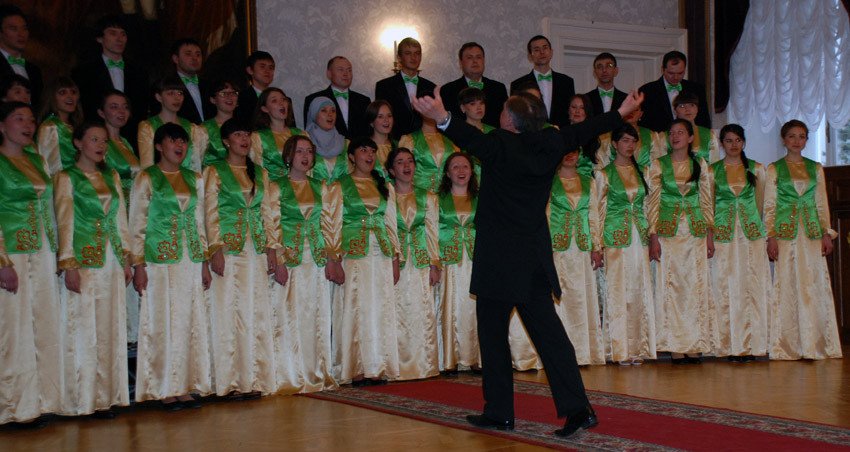 Знаете, в царском университете наряду с алгеброй и прочим в расписание занятий входили хор, оркестр, театр, игра на музыкальных инструментах. Педагоги, занимавшиеся со студентами искусствами, между прочим, получали жалованье ничуть не меньше работников науки. Неудивительно, что первые татарские хоры организовал выпускник Казанского университета 1872 года Степан Смоленский. Слава о его поющих деревенских детях и учителях пошла по всей России. Прокурор Святого Синода Победоносцев, приехав в Казань в 1885 году, написал Александру III: "Кто не слыхал, тот не может себе представить всю особенность татарского пения детей и юношей, столько в нем жизни и выразительности и такая задушевная простота". Затем с хором работали Леонид Егорович Усцов и мы с Левановым.