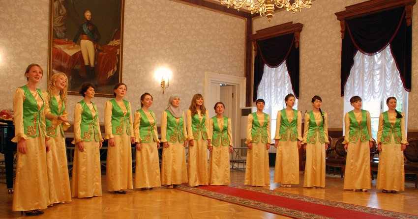 Это выступает Татарский народный хор КФУ, завораживающий мелодичностью исполняемых произведений.