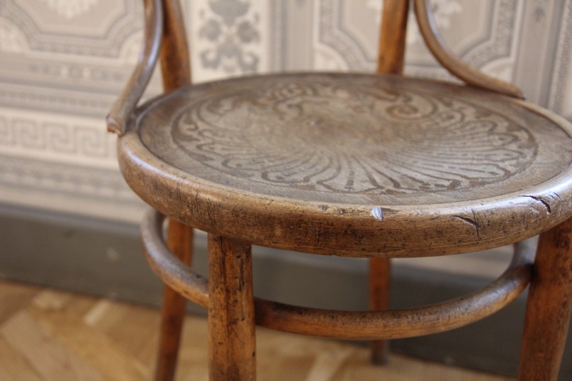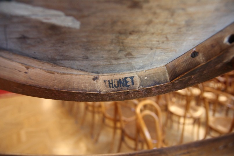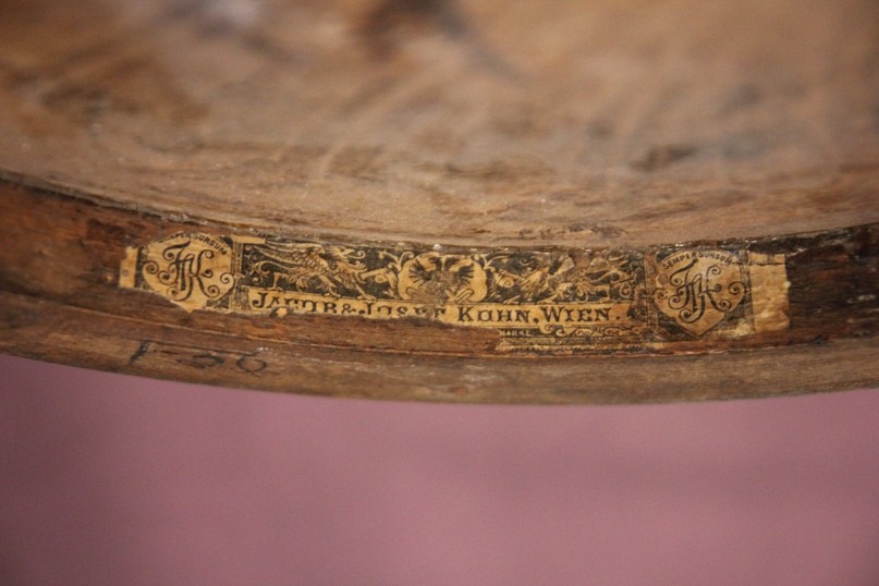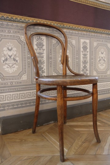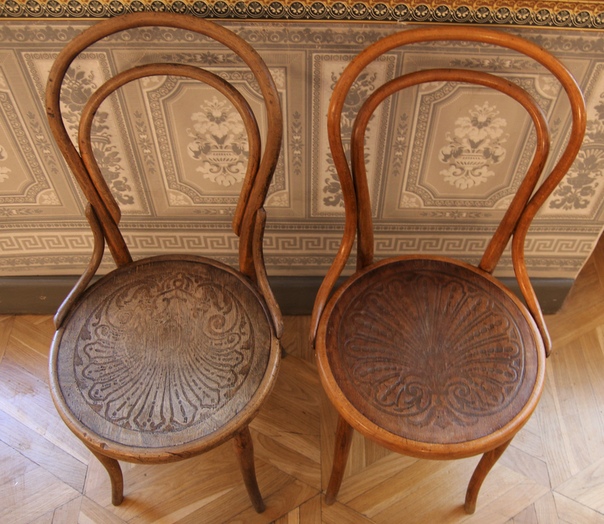 83 стула очень похожи на тот самый, что стояли в университете в 80-е гг. XIX в. Лёгкие, изящные с узором в виде раковины на сидении. Их Республиканская детская больница передала КГУ в 1980-х. Но вот что интересно. Эти стулья выполнены не фирмой «THONET», а их главным конкурентом – «Jacob&Josef Kohn».