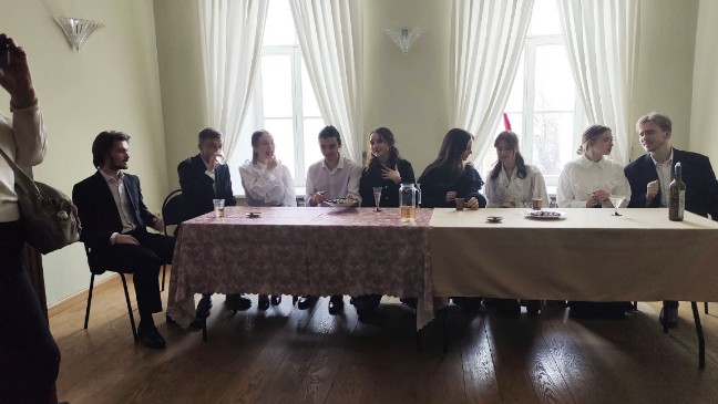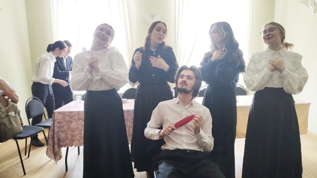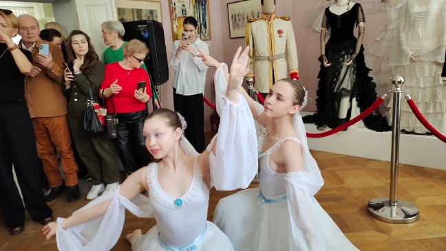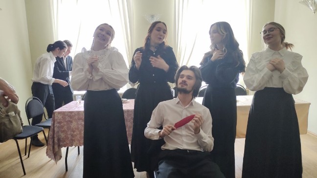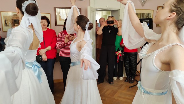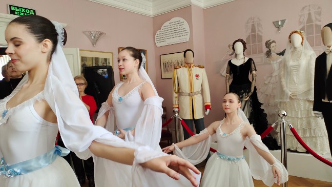В одной из комнат музея юные исполнители танцев к огромному удовольствию присутствующих исполнили один из вальсов Чайковского. А далее зачарованные действом гости выставки увидели театрализованное действо в исполнении студентов КФУ. Была представлена оригинальная версия рассказа Л.Н. Толстого « После бала». Символично, что этот рассказ прозвучал в доме Толстых, а действие сюжета происходило почти в шаговой доступности от музея, на нынешней улице Толстого….
