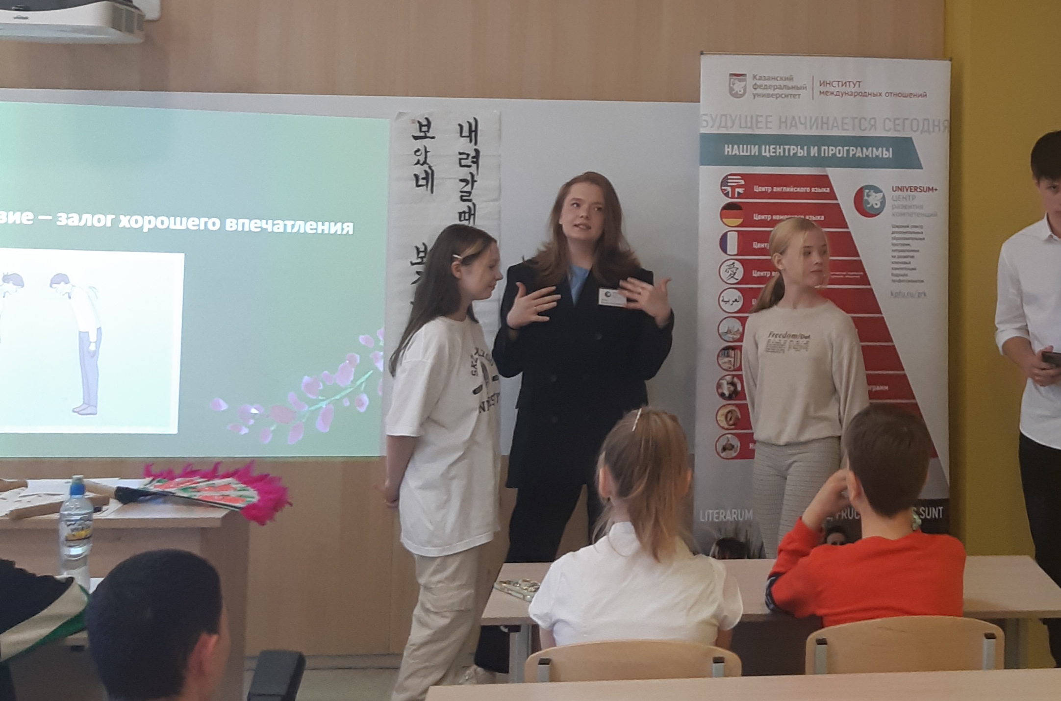 Знакомство с Центром развития компетенций UNIVERSUM+ КФУ у наших гостей началось с корейского языка. Почему корейский язык относится к самым вежливым языкам в мире? А сколько всего стилей вежливости, и какие самые популярные? А вы знаете, как правильно делать поклон и есть ли различия при этом? И это только малая часть вопросов, ответы на которые были даны преподавателем корейского языка ЦРК UNIVERSUM+ ИМО Ситовой Валерией Николаевной. И уже не удивительно, что на мастер-класс пришли школьники 10-13 лет, так как корейский язык, его культура сейчас очень популярны среди юных почитателей K-pop и аниме. Время мастер-класса пролетело быстро, но, несмотря на это, наши гости узнали об алфавите корейского языка, познакомились с семью видами стилей вежливости принятыми в Корее, научились правильно кланяться при приветствии и прощании, выучили слова приветствия и прощания, а в завершении с большим азартом приняли участие в викторине, показав свои новые знания о корейском языке и культуре.